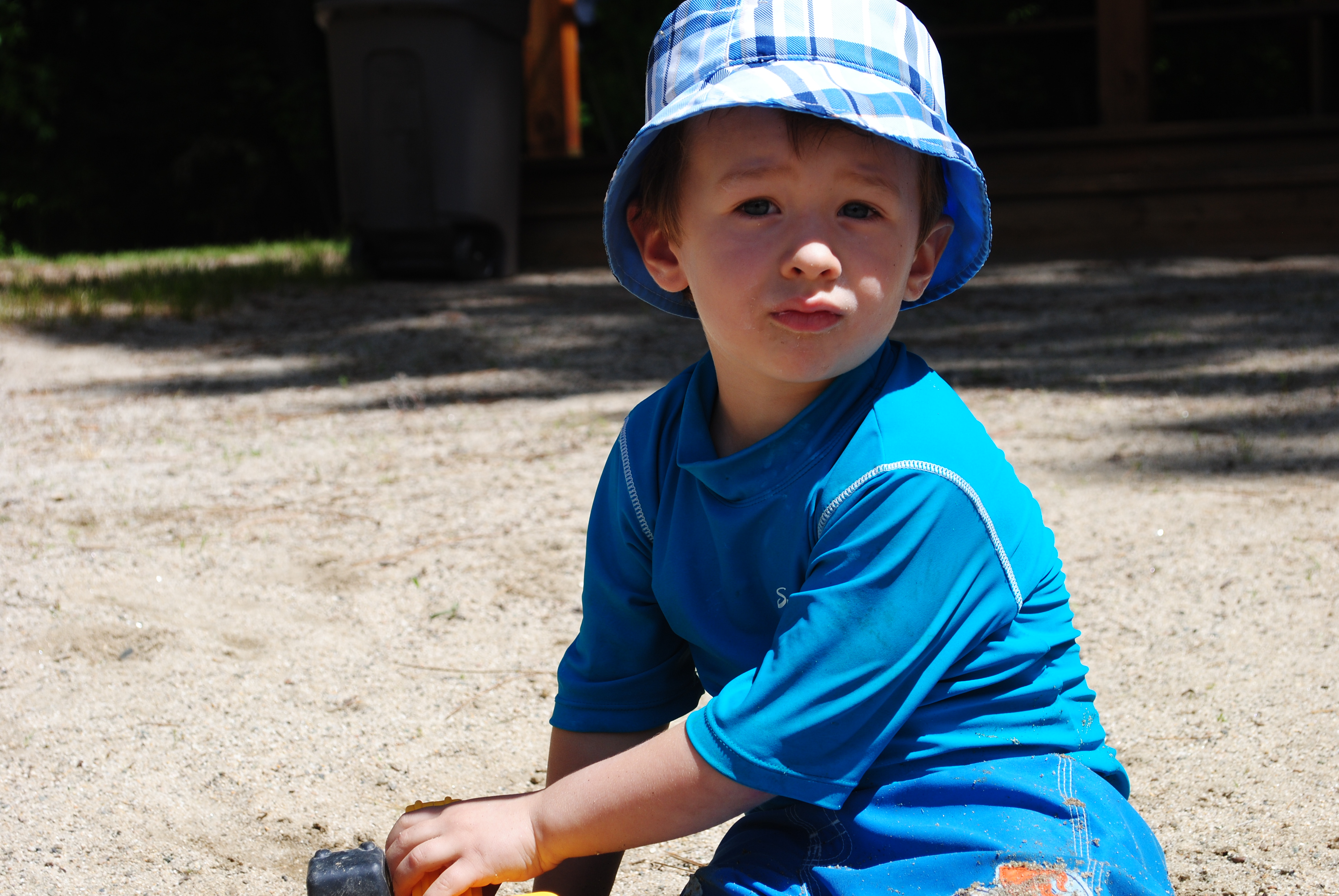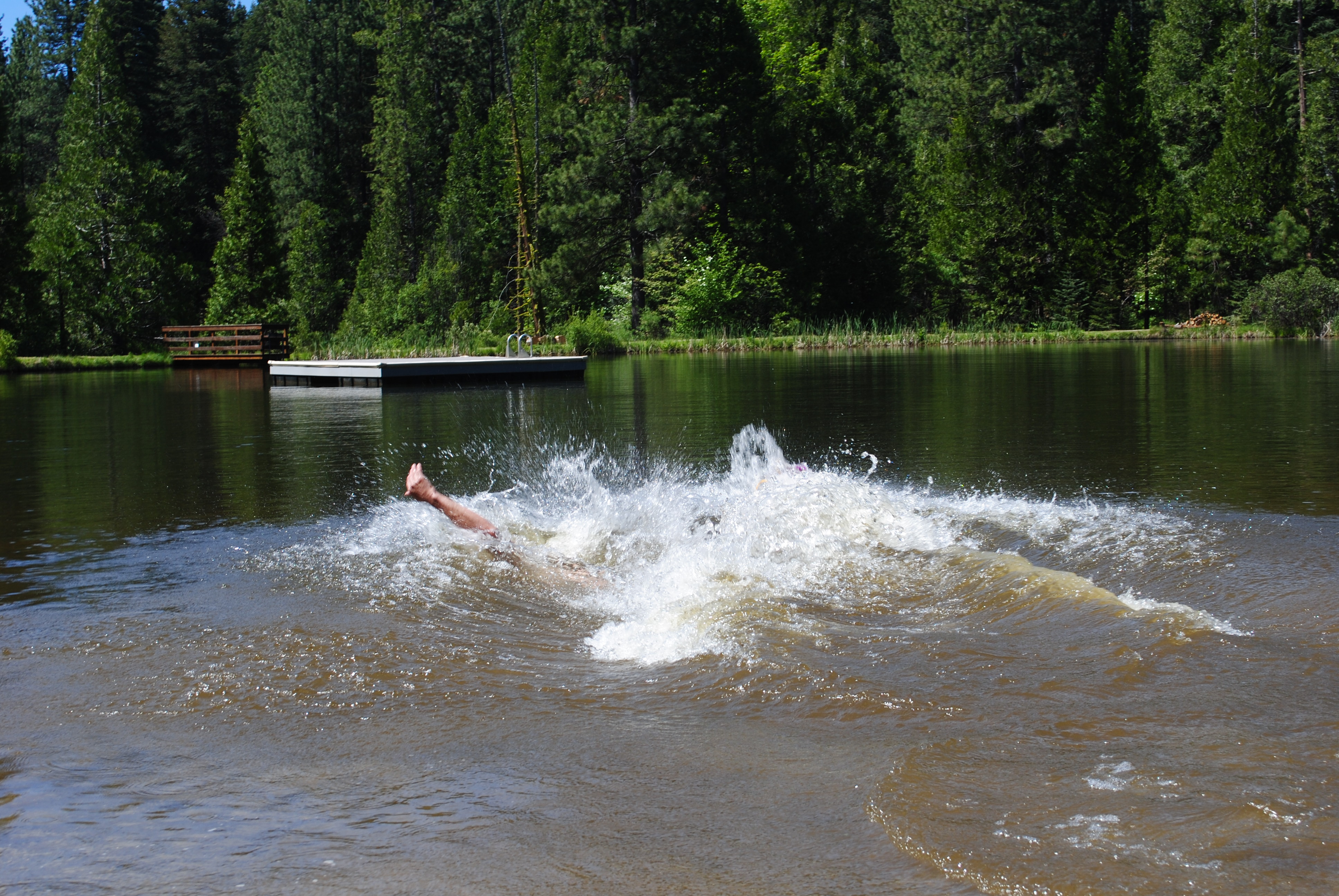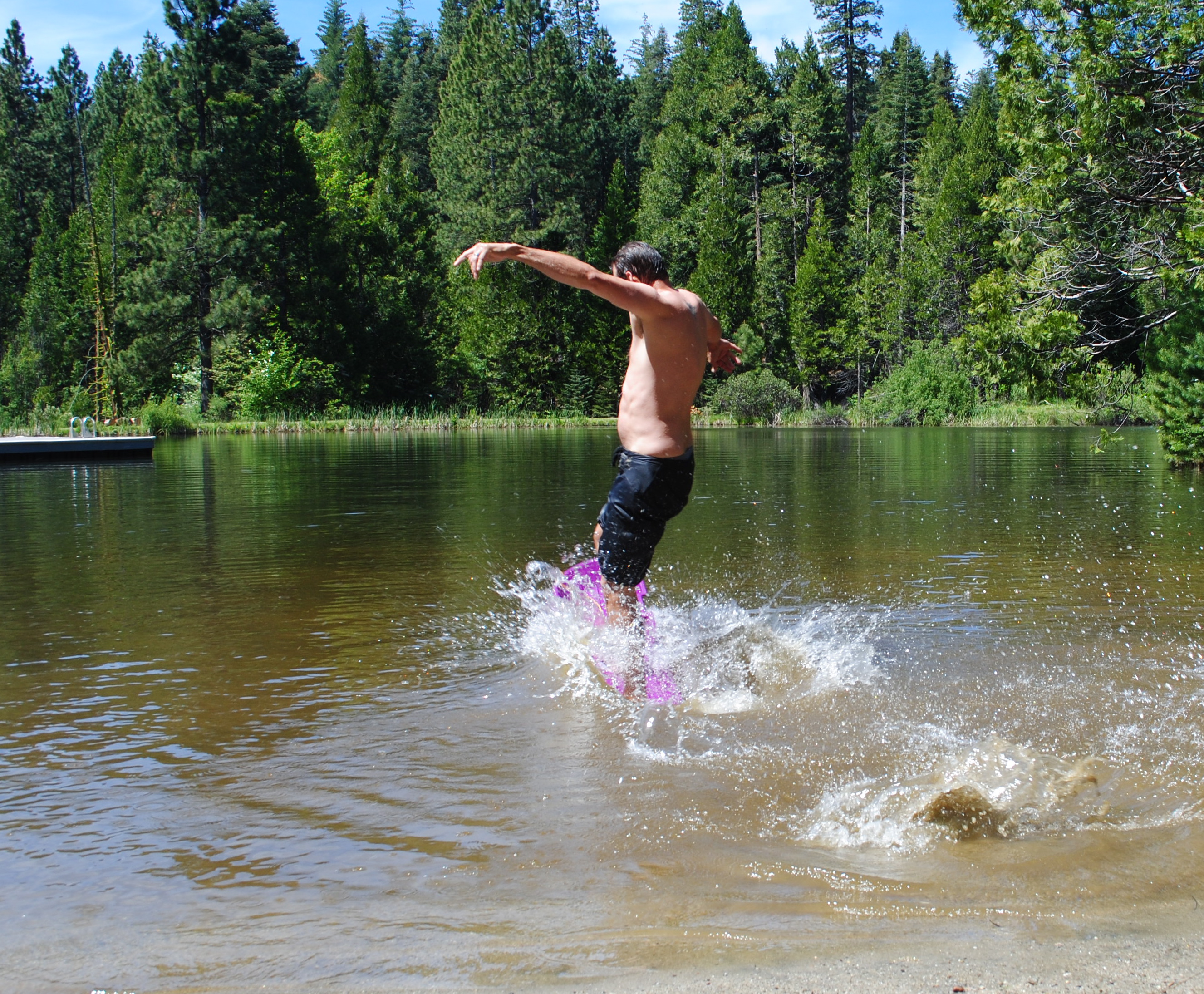 We had to rush out for nap time, but before leaving the Park, I made a pit stop the use the bathroom behind a bear statue. Luckily it did have plumbing, but also fresh urine sprayed over the seat by a giant man dressed in Amish/Quaker clothing. You can bet he got the evil stink-eye outside. DSC_1364And then into swim clothes. Milo made 100+ trips into the lake to fill his bucket and pour water into the sand tributary daddy and friends dug up. Which makes me think he’d be a good farmer. That Midwest blood! And which also led to dad’s DIY scurfing veture… DSC_1360 DSC_1361 He’s always one leg up.
